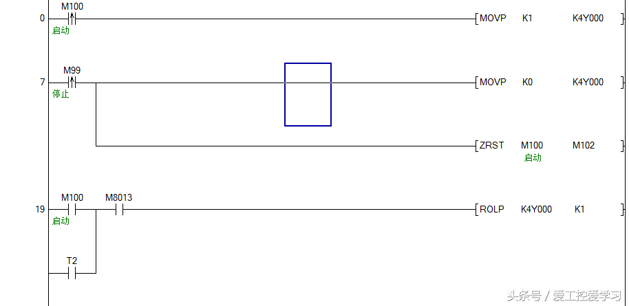 实例说明。三菱PLCFX3U-32MT循环输出流水灯程序。
