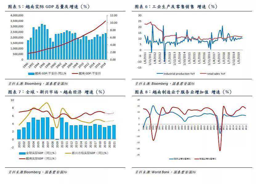 高速成长的越南经济。越南曾经是世界上最贫困的国家之一,人均GDP不足100美元。1986年越南效仿中国实施改革开放,确立了“革新开放的国家发展战略”;1987年,越南批准了《外国投资法》,经济开始进入上行通道。回顾过往30年,越南GDP总量累计翻了近7倍,平均年增长率为6.4%。2006年以来,越南加大了对外开放力度,放宽外资持股比例等政策,积极鼓励外商战略性投资,实现了经济快速增长。2018年越南GDP总量达到2449亿美元,实际同比增速7.1%。今年以来越南经济仍保持强劲的扩张势态,上半年实际GDP增速达到6.8%,其中制造加工工业增长11.2%,服务业增长6.7%。近年来,在全球经济增长中枢普遍下行的背景下,越南作为“一带一路”沿线的成员,经济表现十分亮眼,已逐渐跻身于中等收入国家行列,并得到全球资本的垂青。彭博市场预计,2019和2020年越南实际GDP增速仍将保持6.7%和6.5%的高增速。