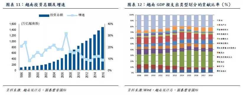 经济结构,随着对外经济政策的不断开放,越南实现了强劲的增长势头。2018年越南GDP总量达到2449亿美元,实际同比增速7.1%。2019年,越南经济保持强劲上升势态,上半年实际GDP增速达到6.8%,其中制造加工工业增长11.2%,服务业增长6.7%。从经济结构上看,若以支出类型划分GDP的话,2018年消费占GDP比重为74.0%,投资占比为26.5%,净出口则占比3.4%。按照行业来划分GDP,农林水产业对经济的贡献程度从2010年的18.4%下降到2018年的14.7%,工业和服务业对GDP的贡献率则分别为34.2%和41.1%。由此可见越南经济并不依赖于出口,工业和服务业是带动经济发展的重要引擎。