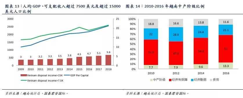 收入端,2018年越南人均GDP为2551美元,2018年越南名义薪资增速7.4%,实际薪资增速也达到3.9%。其中,可支配超过7500美元的人口占从2009年的13.8%,上升至2018年的21.6%;可支配收入超过15000美元的人口占比上升至5.6%。