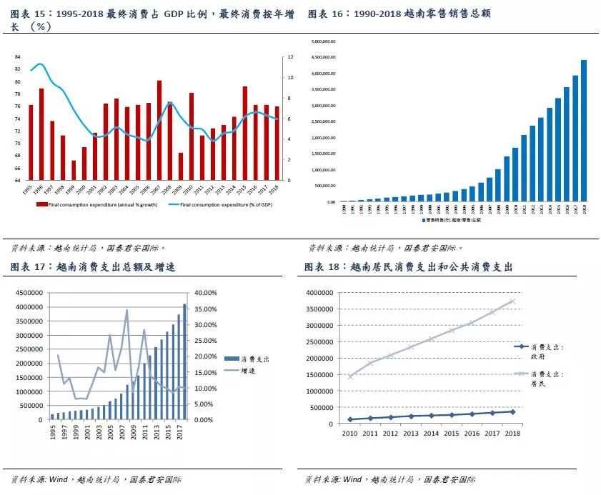 收入带动消费市场崛起。自1995年以来,消费支出呈指数型上升态势。除1999-2001年增速约为6%以外,消费支出始终录得两位数的增幅。2007-2018年来越南商品服务零售销售总额年复合增长率为15.97%,同全国人均收入的16%的年复合增长率相近。2018年,越南最终消费支出在GDP中的占比超过73%,是GDP最重要的组成部分。