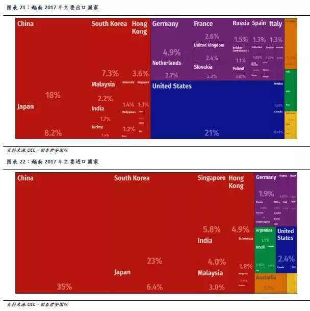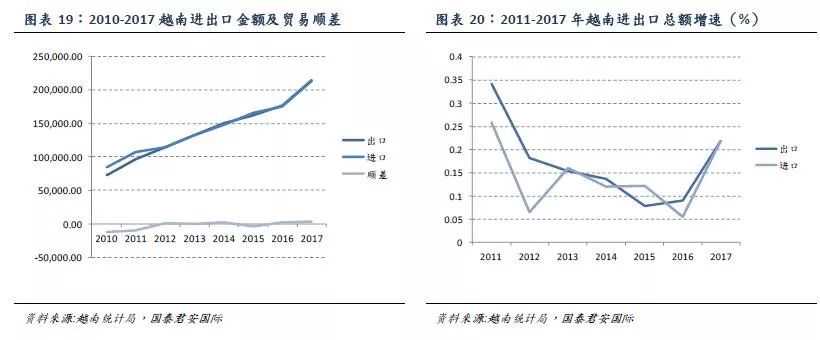 进出口整体保持高速增长,外资经济成分逐渐占据进出口经济的主导地位。自越南1986年效仿中国“改革开放”以来,确立了越南的“革新开放”,出台了一系列政策大力推进对外贸易,主要包括对外经济多元化、外交为经济服务、变革外贸体制、下放管理权限、调整汇率,以及财政、信贷、资金等各个方面的改革。上世纪90年代,越南大幅精简了其贸易规定,并先后于1995年和2007年加入东盟和世贸组织,使越南的进出口整体维持了高速的增长。据越南统计局数据,2017年越南进出口总额达4,283亿美元,其中出口和进口总额分别达2,151亿美元和2,132亿美元。