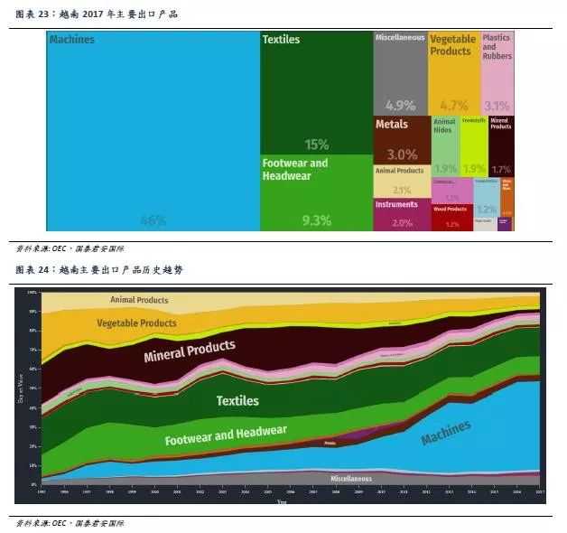 加工贸易占主导地位。根据HS92分类标准下的联合国贸易和发展会议数据,2017年越南出口产品的前五大品类分别为机器设备、纺织品、鞋帽、植物产品以及塑料和橡胶制品,分别占出口总额的46.0%、15.0%、9.3%、4.7%和3.1%。出口机器设备中,广播设备、电话和集成电路为占比最大的三个子品类,合计约占出口总额的27.4%。出口纺织品和鞋帽主要为各类成品服装和鞋帽产品,植物产品以咖啡、大米和椰子坚果为主。近年趋势上,越南主要出口产品逐渐从农产品和原材料等第一产业演变成机械设备等第二产业,表明越南正进入工业化时代。