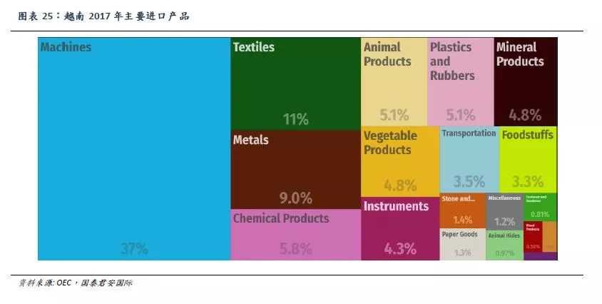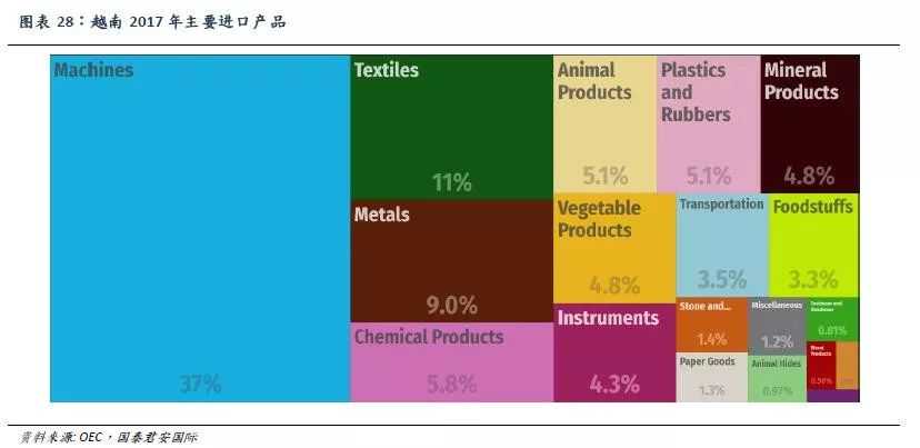 2017年越南进口产品的前三大品类分别为机器设备、纺织品以及金属制品,分别占进口总额的37%、11%和9%。进口机器设备中,集成电路占比最高为7.6%。进口纺织品主要为各类纺织纤维及织物原料,进口金属制品主要为铝材、钢材、铜材等金属材料。结合进出口产品的品类可以看出,越南相关产业中,加工贸易占据了较大的比例。