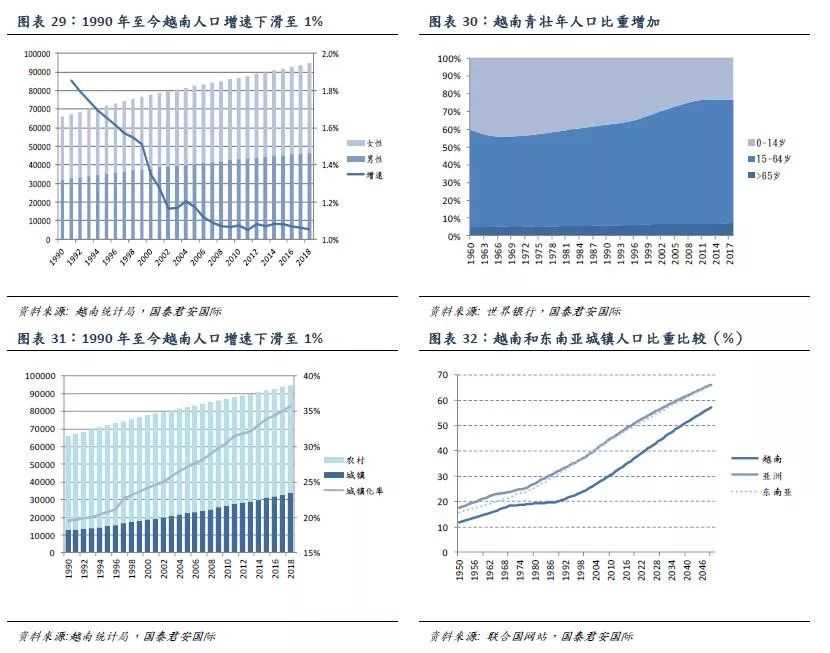 人口总数以及城镇人口比例均稳步提升。1990年以来,越南人口增速逐步下滑趋近1%,过去5年越南的人口年均复合增长率约为1.07%,至2018年越南全国共有人口9466.6万人。2010年后越南人口中的男女比例常年维持在0.98左右,女性人口略多于男性,但近十年来新生儿的男女性别比例都维持在1.1以上,并且农村地区男女比例约为1.01。