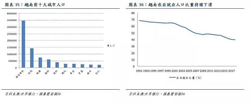 越南人口持续向大城市流动。从1990年开始,越南最大城市(胡志明市)人口占比变动不大,维持在25%左右,但(常住人口在100万以上的)大城市的人口数量占总人口比重持续拉升至17%,预计这一上升趋势仍将持续,人口将继续向大城市流动。目前越南人口密度为308人/平方千米,而河內市与胡志明市人口密度分別为平方公里2398人/平方千米和4363人/平方千米。世界银行预计越南在2030年将拥有一个1000万人口以上的超大城市、一个500-1000万人口的特大城市和一个100-500万人口的大城市。