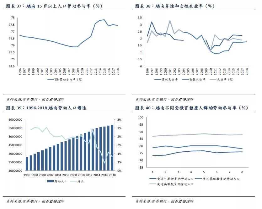 劳动人口线性增加,越南女性劳动参与率较高。越南劳动人口在1996-2013年期间基本呈线性上升趋势,而2013年过后劳动人口增速出现显著下滑,最低在2016年达到0.4%,2017年失业率为1.88%。15岁以上人口的劳动参与率自2009年起开始拉升,最高接近78%,其中越南女性的劳动参与率约为73%,高于发展中国家和全球平均水平,而男性的劳动参与率约为82%,和女性差距不大,因此越南劳动参与率的男女比例高达81%,超过世界平均水平67%和部分东南亚国家,如印尼、菲律宾、泰国等。若按受教育程度划分,受过高等教育/中等教育/基础教育人群的劳动参与率为87.7%/78.0%/75.7%,当中受过基础教育人群的劳动参与率近年来有一定提升。