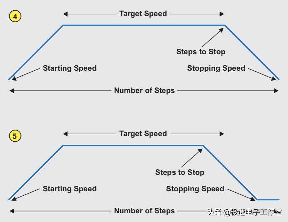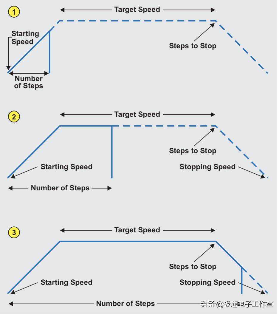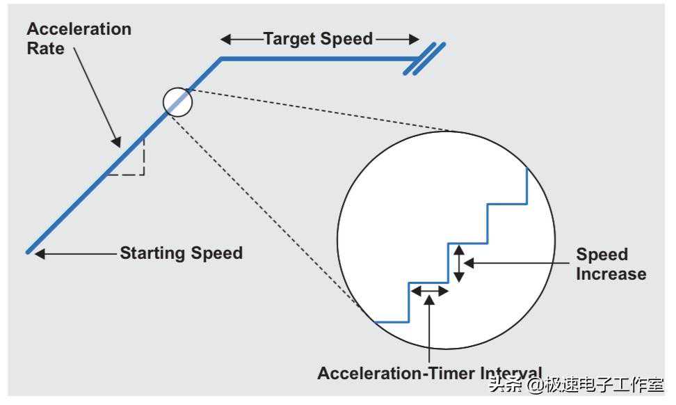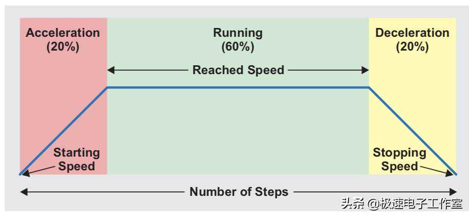 我们知道对于直流马达而言,可以通过升高电压(若是使用脉宽调制,则通过增加占空比)可以控制马达的速度快慢。但是,对于步进马达,改变其驱动电压不会对速度产生任何影响。若以任意速度启动步进马达,速度过快时会带来意想不到的一些结果,比如步进电机失步、堵转等问题,而这些问题都是需要在应用中避免出现的,为此,我们需要让步进电机从一个较低的速度慢慢加速到指定速度的过程。