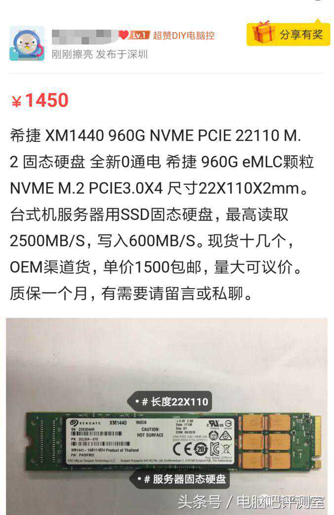 首先这玩意你只能去闲鱼买到,这玩意是22110规格的,你要先看看你的主板能不能上这么长的,不能就只能扩展卡走起。而且这东西虽然是eMLC,但是速度很一般,适合用来做仓库,米黄色的钽电容是拿来做掉电保护的。个人就有一块规格类似的PE3110960GB。不过早就已经卖光了。而且闲鱼是没有保修的,买之前务必三思。