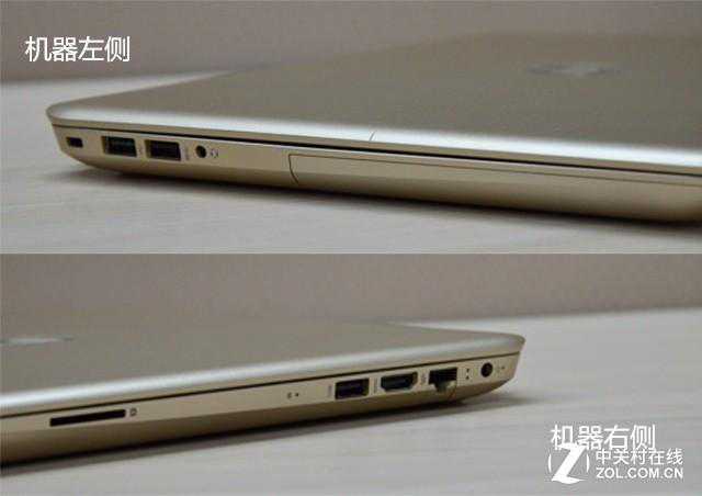 机身左侧接口分别为安全锁孔、1×、1×、耳机/麦克风一体接口,右侧分别为电源插孔、网线接口、HDMI接口、1×、SD卡插槽。整体上该机接口在数量上比较完善,能够满足日常使用。机身后面为出风口,转轴部分采用的是金属材质、亮面设计,与机身香槟金相呼应,这种撞色设计并不会让转轴显得突兀,相反这种点缀处理让机身更显时尚。