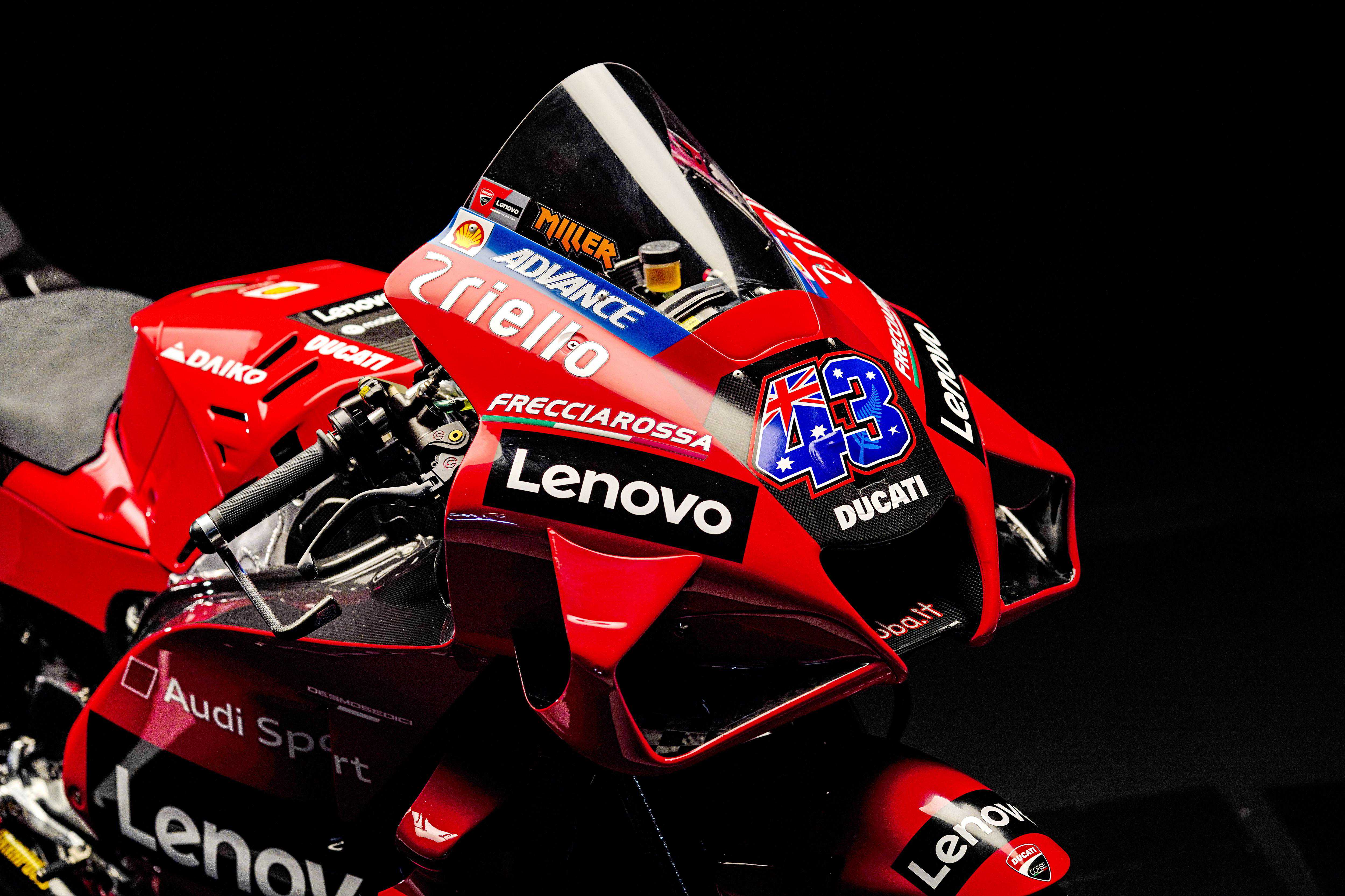 MotoGP新的2021赛季,杜卡迪工厂车队的车手组合,是去年已经发布的、全面年轻化的澳大利亚车手米勒(JackMiller,43号车)和意大利车手巴纳亚(PeccoBagnaia,63号车)。