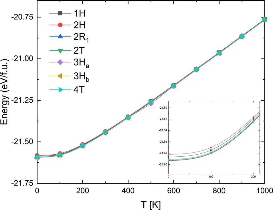 图1显示了7种稳定晶型的能量-温度曲线。如下图所示,提高温度并没有改变晶型之间的相对稳定性。事实上,只有在400到600K之间,可以看到一个小的偏差,在500K时3Ha转变是最稳定的变形。这意味着温度对这些多态性不是一个很大的因素,人们可以为特定的应用程序选择最合适的一个,而不必考虑相变。