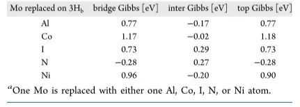 通过掺杂降低了3Hb-MoS2的吉布斯自由能,使基面与边缘位竞争,尤其是N对Mo的竞争。