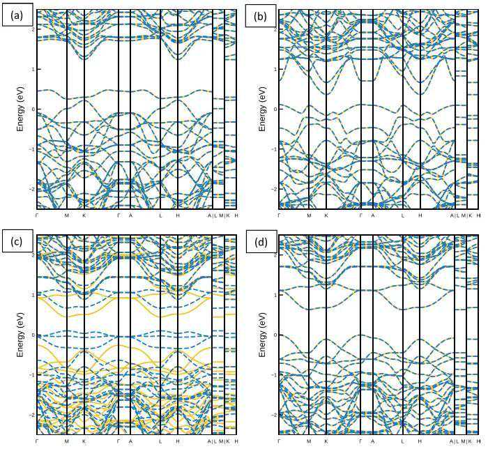 图4.掺杂3Hb的GGA能带结构。(a)Mo被Al取代,(b)Mo被I取代,(c)S被Co取代,(d)S被Ni取代。