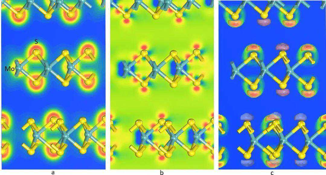 图7a所示的3Hb-MoS2的电荷密度图清楚地表明,电子位于单个原子周围。此外,Mo-S与S-S之间的电荷分布表明,Mo-S与S-S之间的键合以离子型为主。图7b中的电荷转移图显示了Mo原子周围的电荷消耗,得到了S原子周围和Mo和S原子之间的电荷积累。
