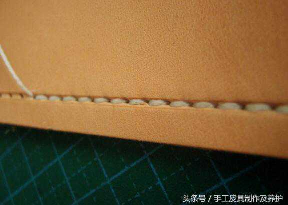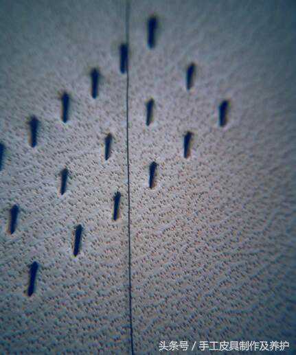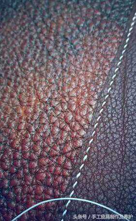 软皮上的线迹通常是这样。微距拍摄,出线与入线的间距为0.4毫米宽度。