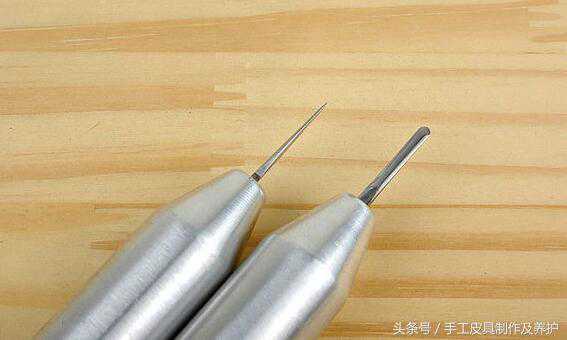 锐锋斩国内相对少,新手买到时多以为是打磨程度不同,实际这本就是不同的斩种。锐锋斩的穿透力强,一般适用于厚度较大的日式皮具,背面打穿时斩孔的毛边较少,斩孔形状也更工整。但由于斩锋部分的转折式线条设计,手腕稍微放松,背面就可能会打歪,有时甚至会歪出很多,属于难用的上级者向斩。