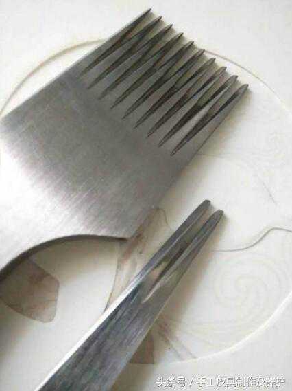 斩的斩刃是六棱形的,在线孔两端各有微小的开角,避免了长时间使用后线孔变形的问题。所以高端皮具上一般都使用这种斩。不过刚拿到手的新斩是不能立刻用的,因为出厂时的线孔太宽。欧式各流派的线孔长度都有微小的差别,英式,法式,意式的线孔感觉都不一样,所以要自己二次打磨斩齿,不能拿来就用。下图是我自用的斩,可以看出打磨的形状,法式齿宽。