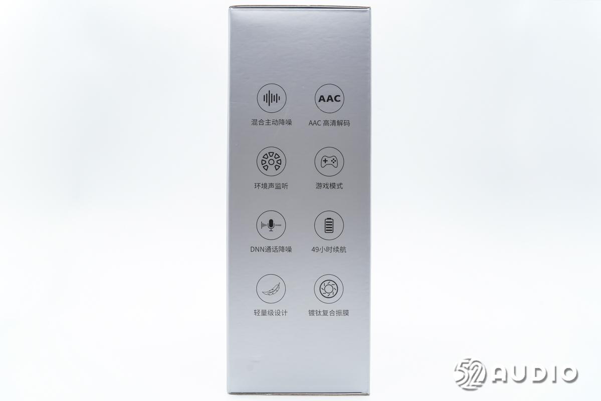 包装盒侧边图文展示了产品特点,包括:混合主动降噪、AAC高清解码、环境声监听、游戏模式、DNN通话降噪、49小时续航、轻量化设计、镀钛复合振膜。