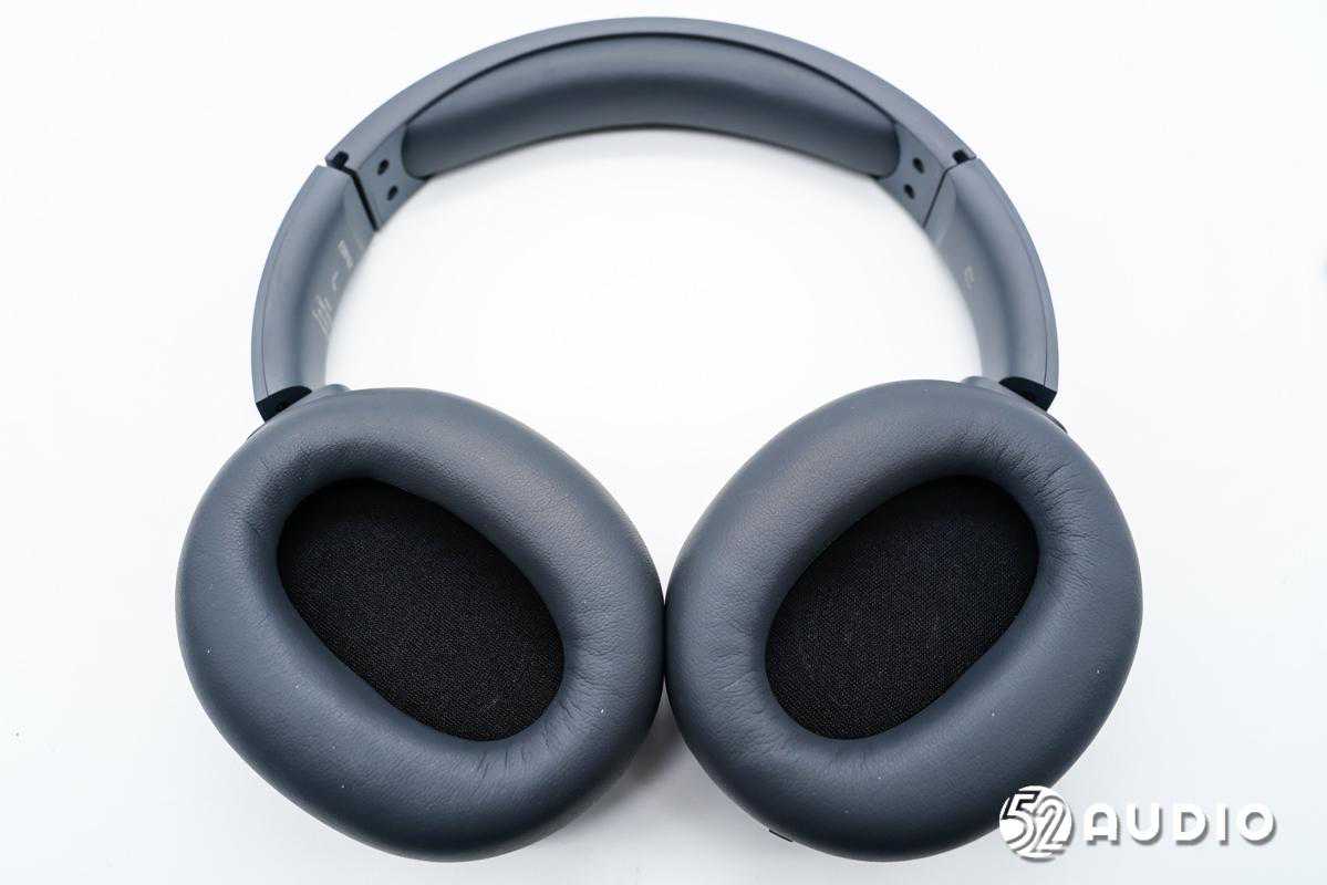 耳机内侧外观一览,头垫与耳罩采用了类皮革材质,内部柔软物填充,分散压力,提升佩戴舒适性。