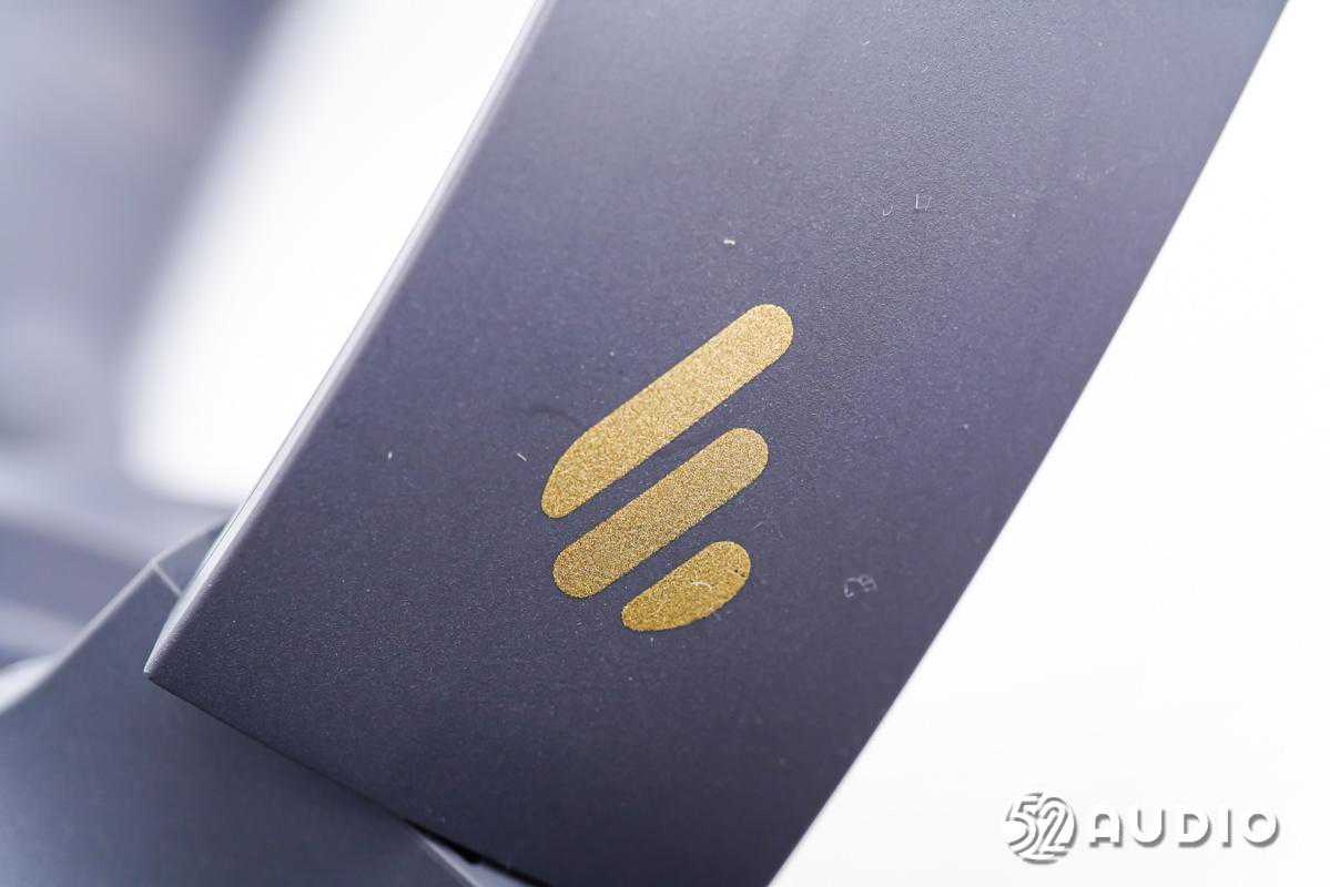 头梁外侧上的金色漫步者品牌LOGO特写。