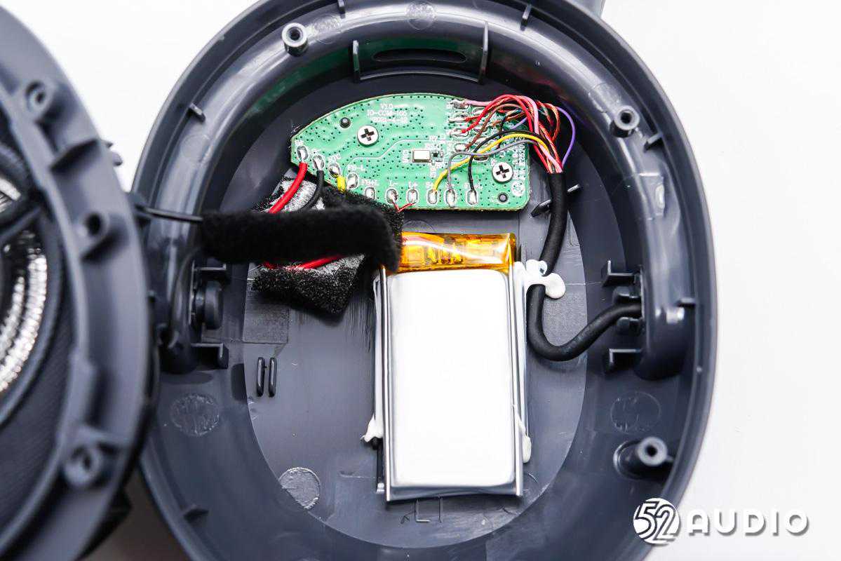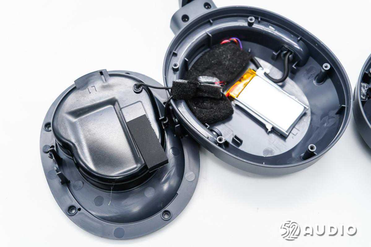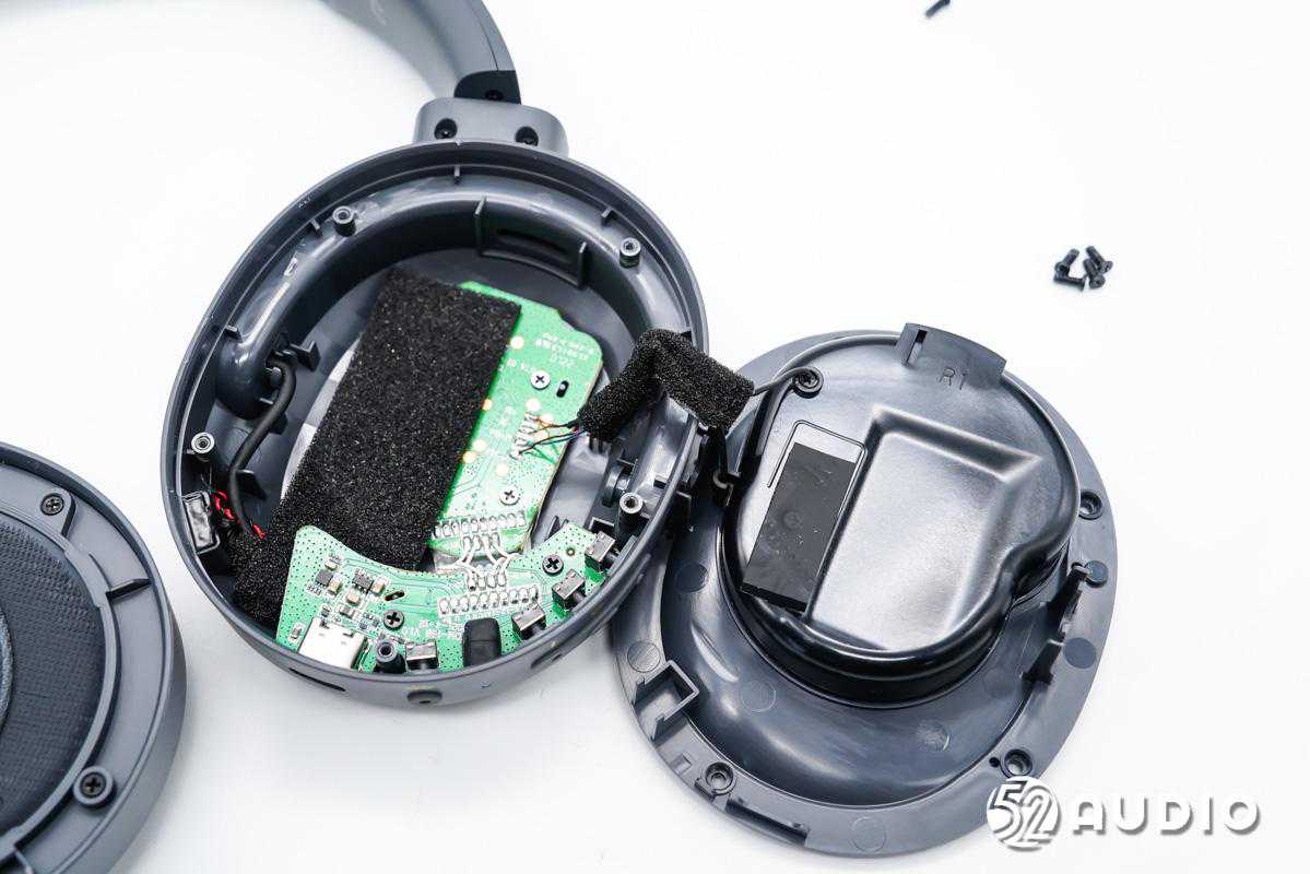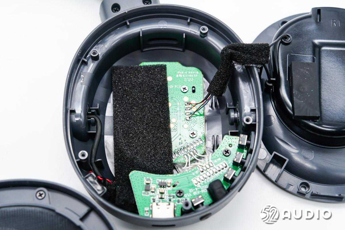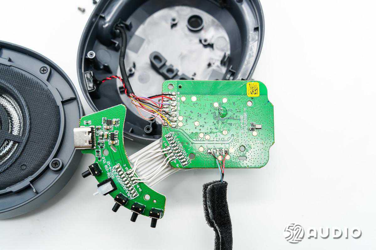 内部结构配置方面,左右耳机内均搭载了40mm镀钛复合振膜动圈单元,前馈驻极体麦克风+后馈MEMS麦克风的组合,用于混合主动降噪功能拾取环境噪音。其他方面,右耳内部设置主板和电源输入小板,以及一颗通话拾音麦克风;左耳则设置电池单元。