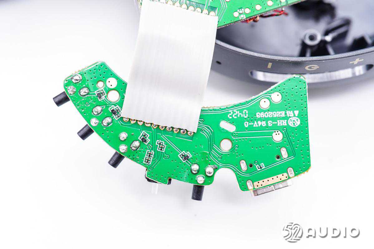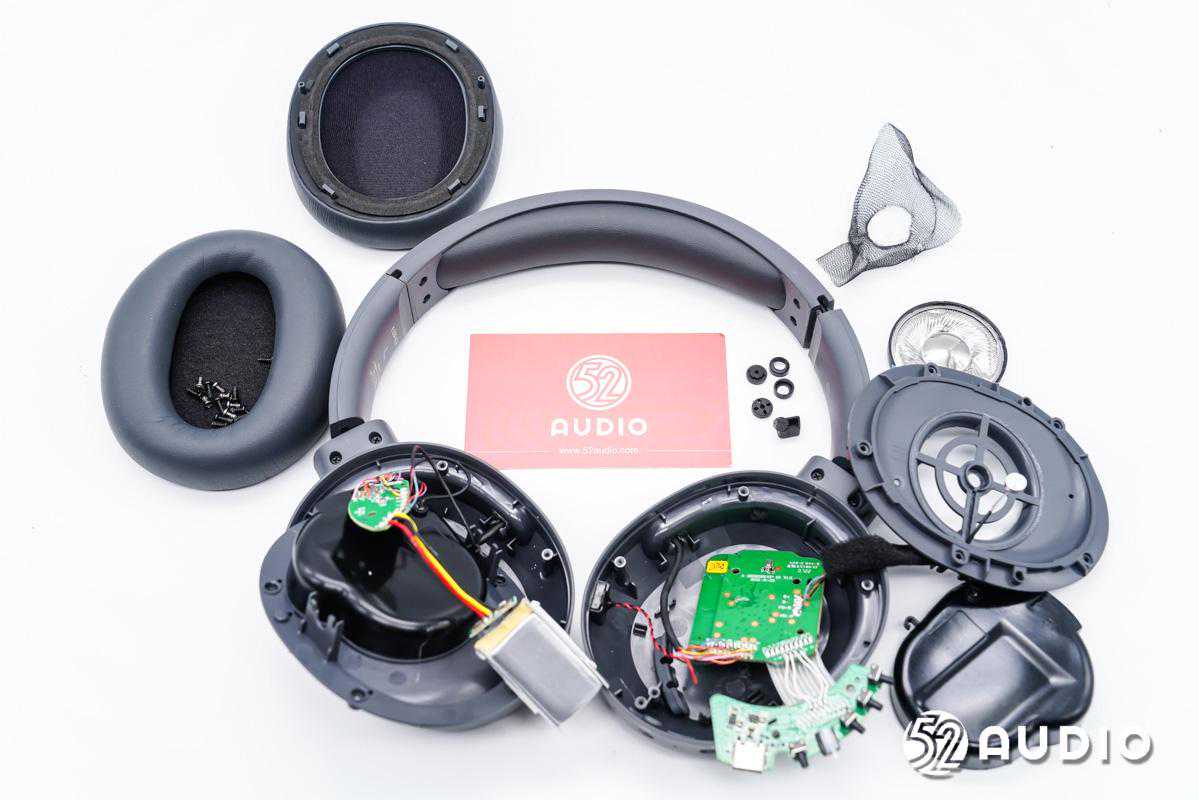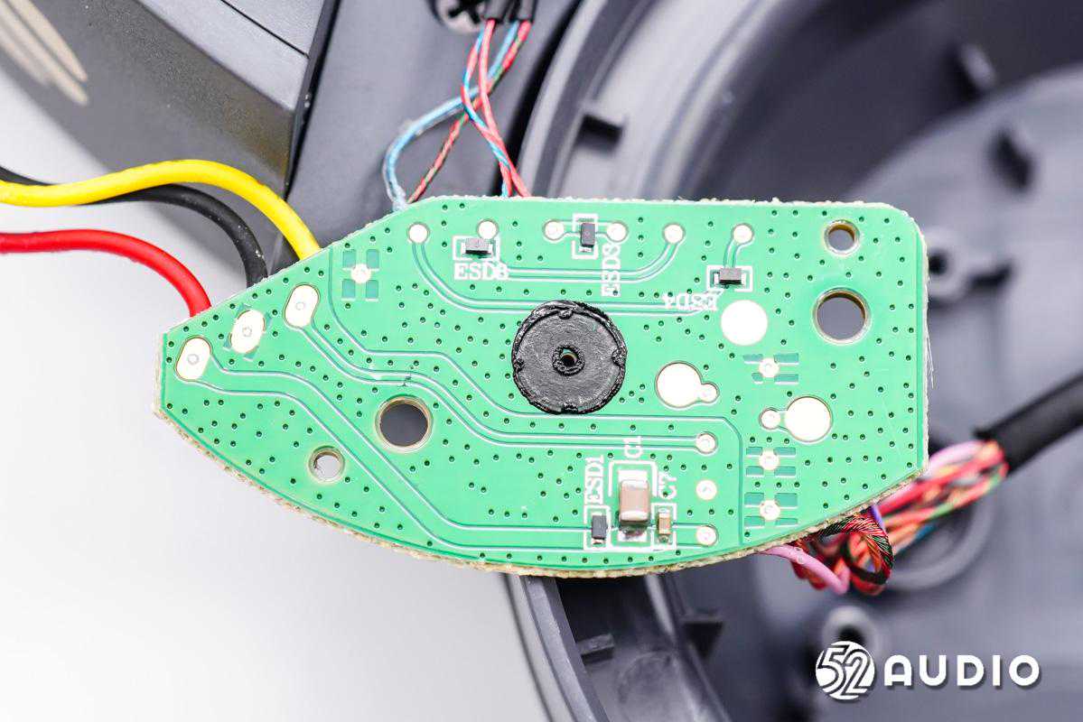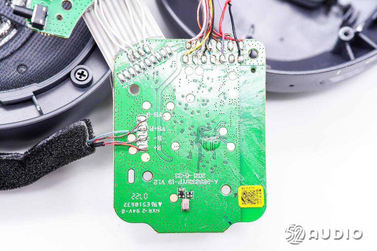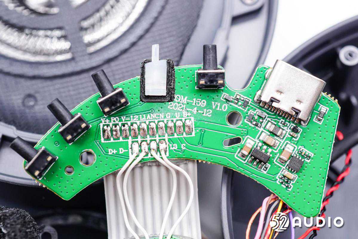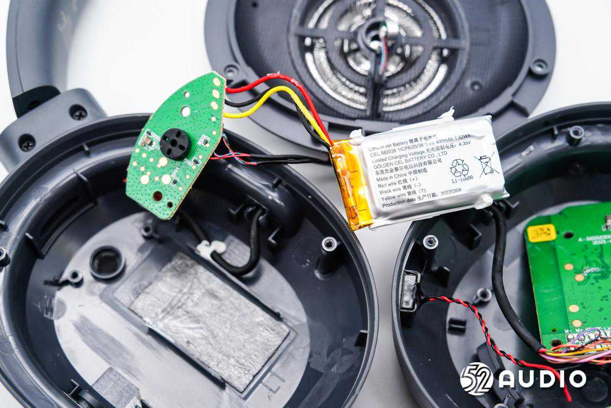 内部结构配置方面,左右耳机内均搭载了40mm镀钛复合振膜动圈单元,前馈驻极体麦克风+后馈MEMS麦克风的组合,用于混合主动降噪功能拾取环境噪音。其他方面,右耳内部设置主板和电源输入小板,以及一颗通话拾音麦克风;左耳则设置电池单元。
