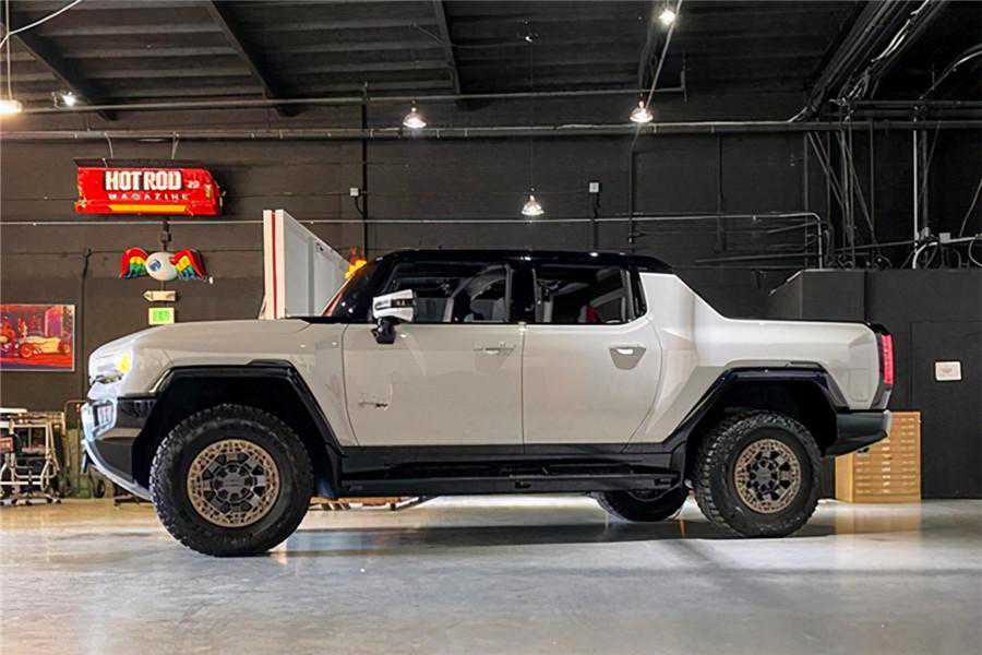 车身侧面,悍马EV配备了全地形轮胎,防脱圈轮毂以及侧踏板,车顶采用撞色涂装,并且是可拆卸式的设计,能够实现露天驾驶。尾部货厢采用了两段式开启的尾门,另外在车头还有一个巨大的前备厢,非常实用。