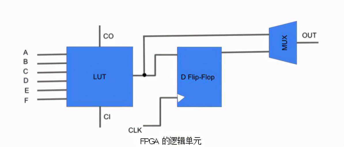 我们有一个查找表(LUT)作为FPGA逻辑块的核心。本质上就是一个RAM。它把数据事先写入RAM后,每当输入一个信号就等于输入一个地址进行查表,找出地址对应的内容,然后输出。构建块的输出是多路复用的。多路复用器的一个输入是LUT的直接输出,用于纯组合逻辑,如NAND,NOR,XOR或其他逻辑门。多路复用器的另一个输入是经过d型触发器并与时钟同步存储的LUT的注册输出。