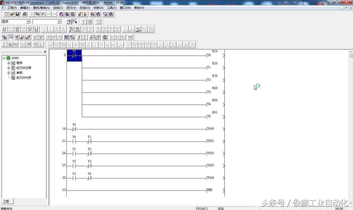 这里是整个流水灯梯形图,我用到了5个输出Y