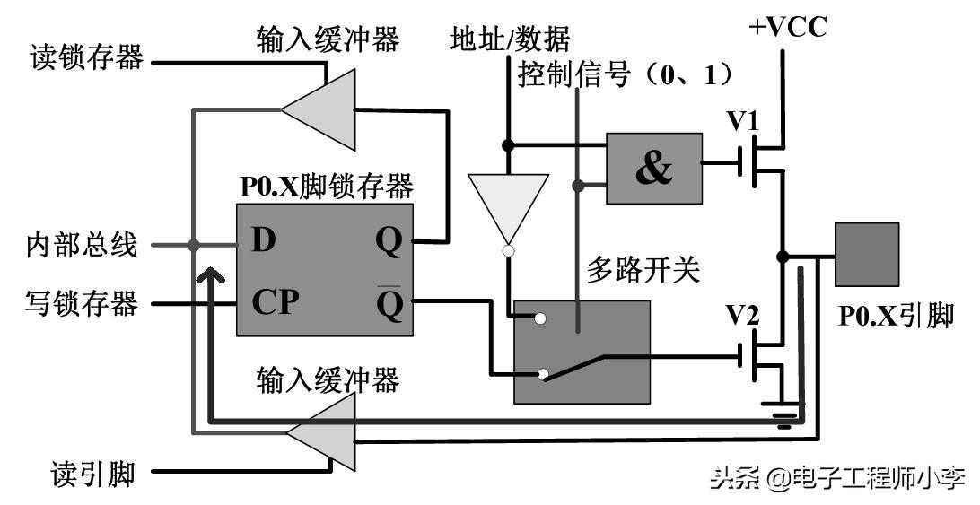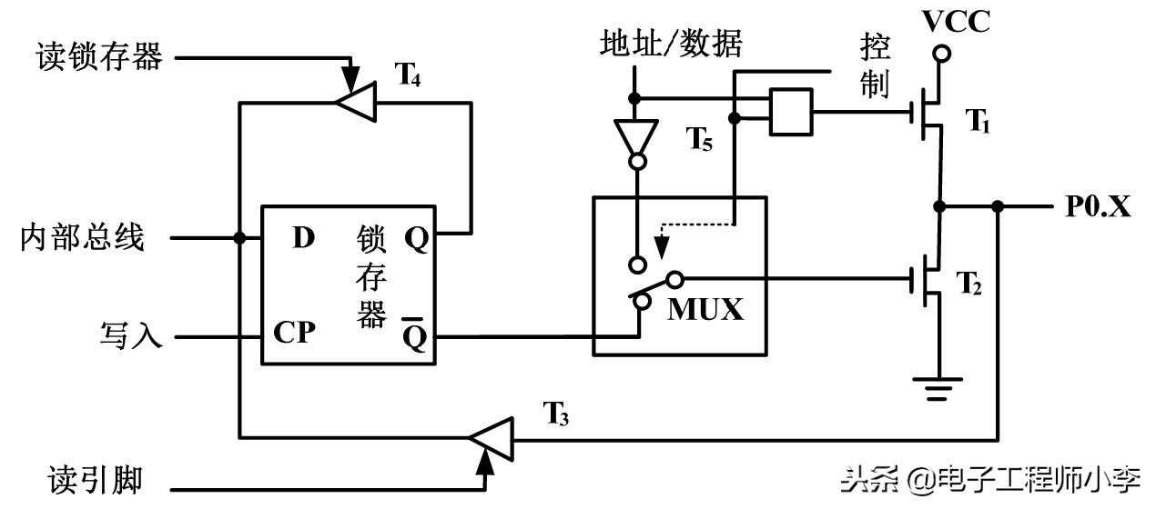 上面已对P0口的各单元部件进行了详细的讲解,下面研究一下P0口作为I/O口及地址/数据总线使用时的具体工作过程。