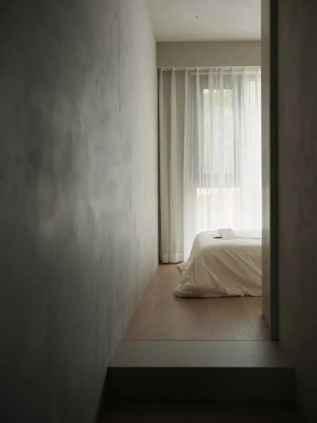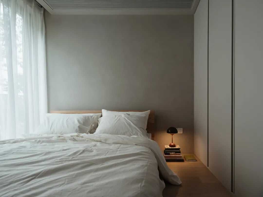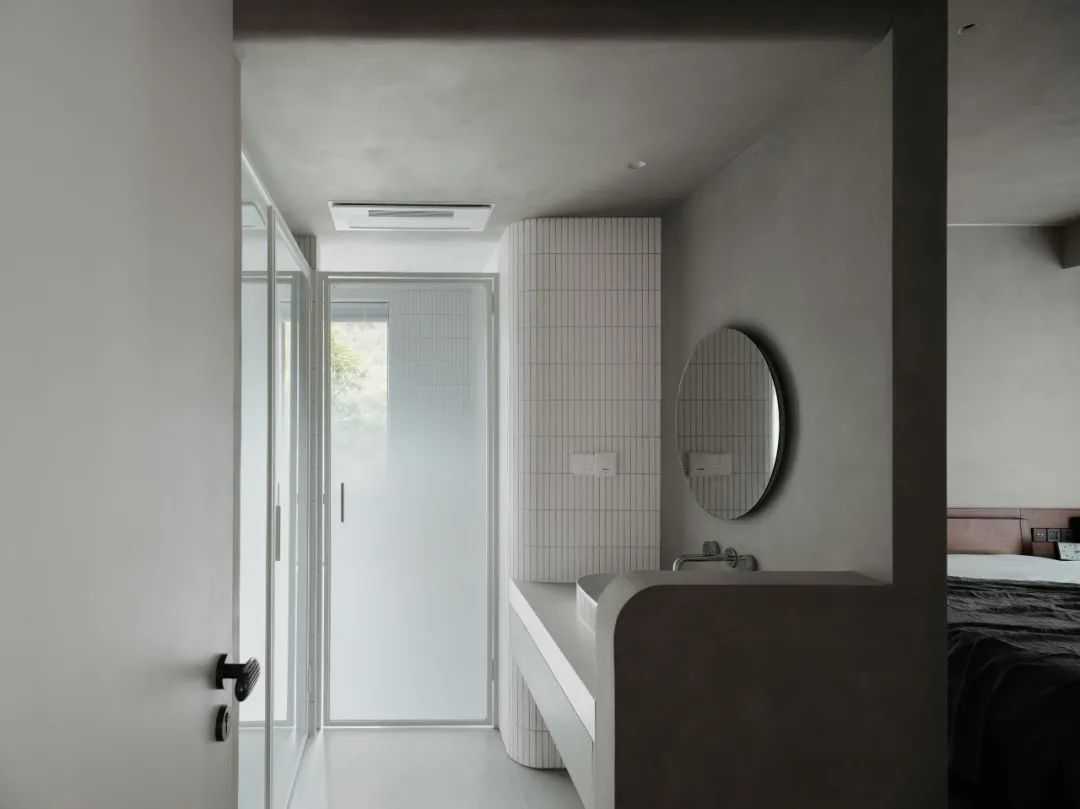 所以,我希望空间可以更加的建筑化。因此,大面积的灰白色延伸向大部分的空间面积。同时,我们通过技术手段,让空间中的大部分材质(涂料、定制木作、岩板、窗帘、瓷砖等)的视觉感受达到统一。这种协调的美,无疑是舒适的。