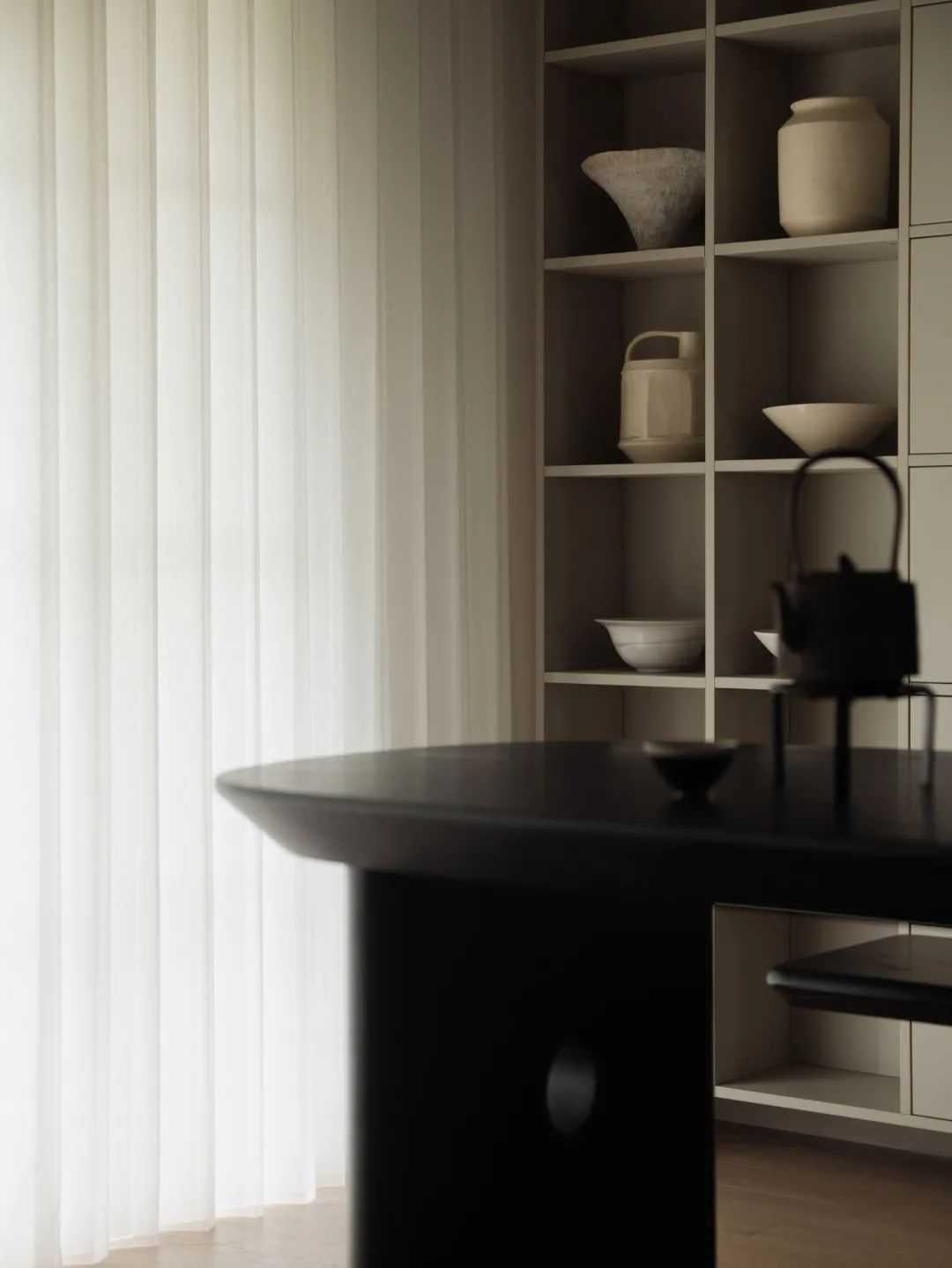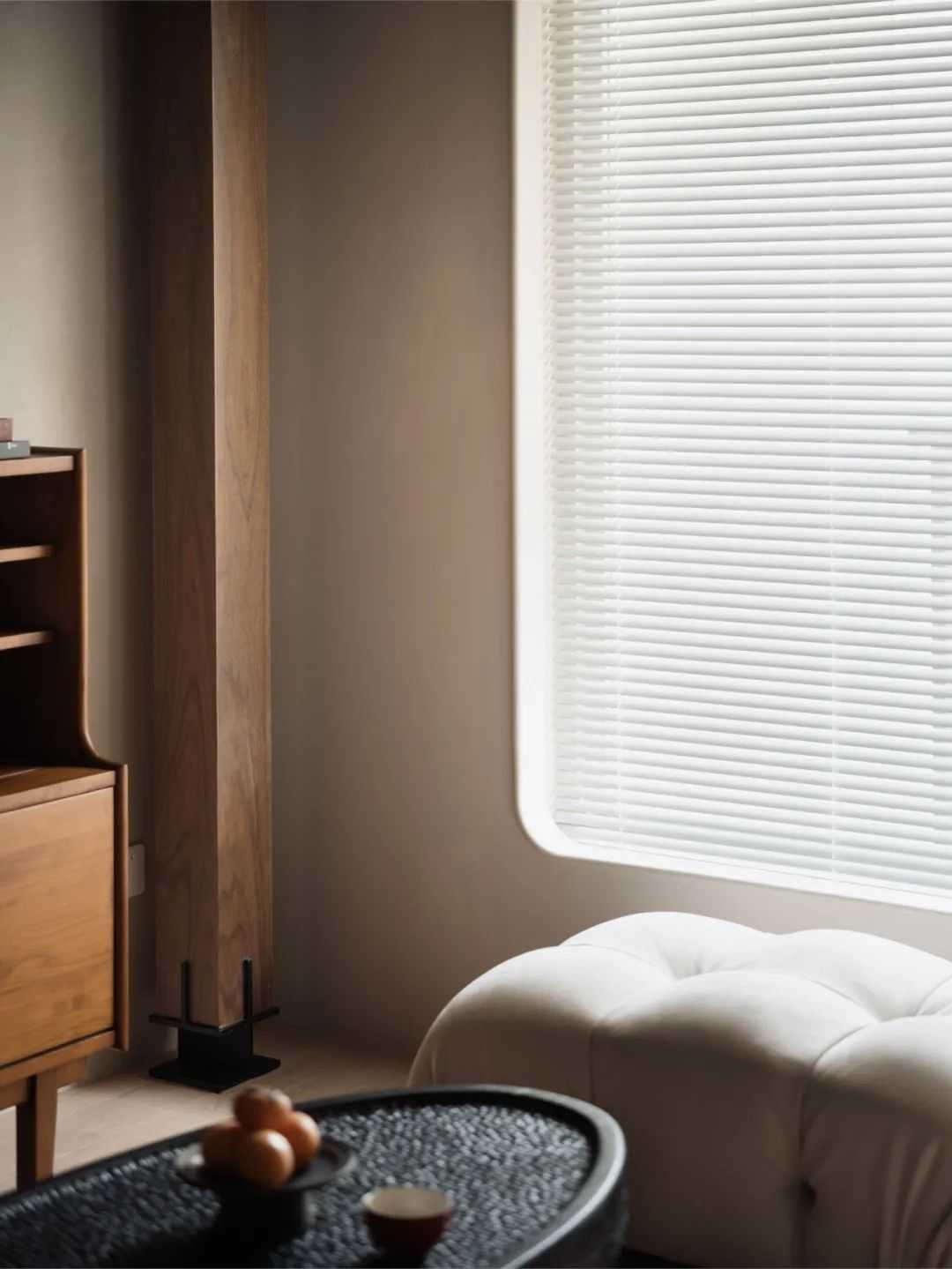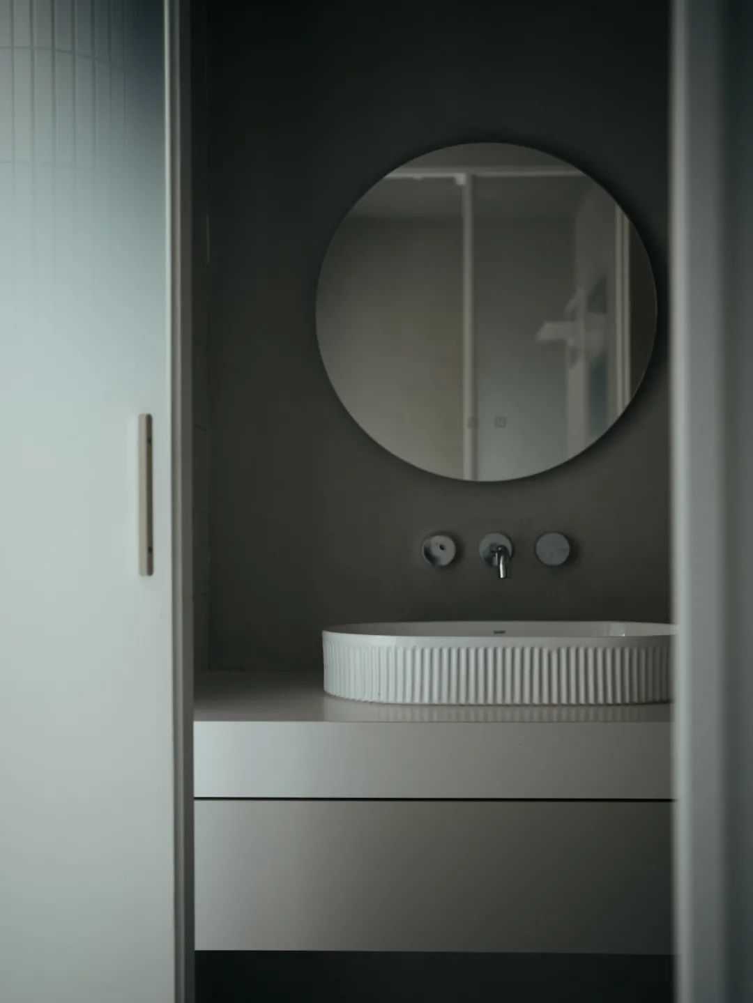 所以,我希望空间可以更加的建筑化。因此,大面积的灰白色延伸向大部分的空间面积。同时,我们通过技术手段,让空间中的大部分材质(涂料、定制木作、岩板、窗帘、瓷砖等)的视觉感受达到统一。这种协调的美,无疑是舒适的。