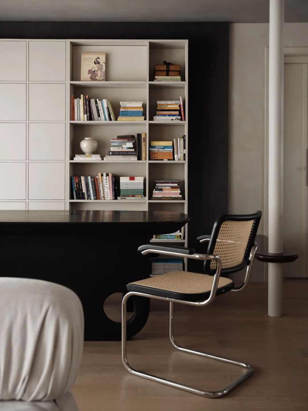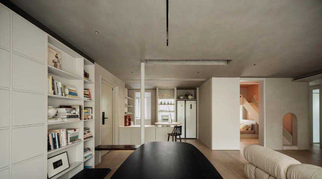 首先,我将原本邻近客厅的次卧室墙体进行了全面拆除,从而得到了一个较为宽大的横厅。正因如此,我才有了条件,将客厅前移,使其成为整个空间的中心部分。同时,前移后的客厅也为新的就餐区域提供了较为舒适的空间尺度,以此满足了书柜与条形餐桌的安放。因为餐厅区位的重新规划,所以原餐厅空间得以被释放,为我的西厨空间创造了合理的条件。这无疑是为原本局促的厨房空间进行了从容且有力的补充。