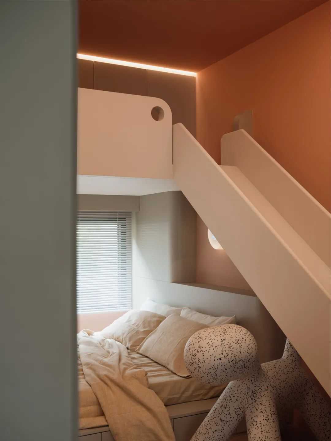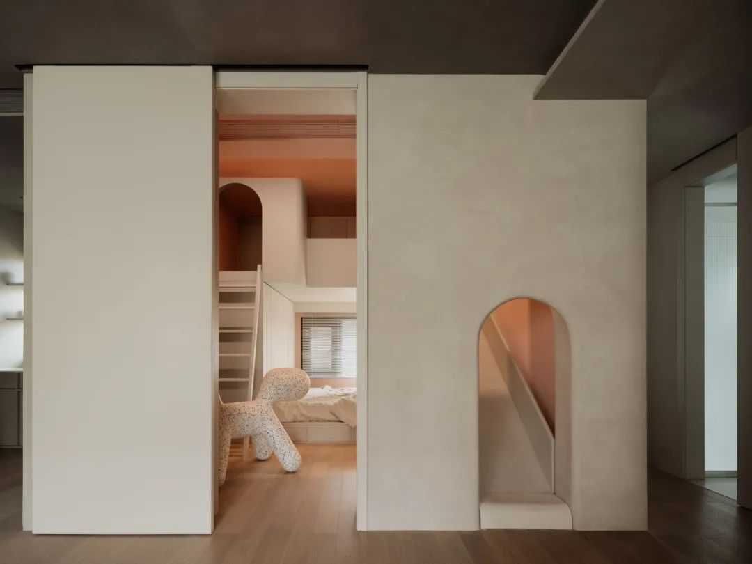 女儿房则更像是我送给女儿的一件礼物。虽然她不常生活于此,但我仍然“自私”的希望,这样的空间设置,将勾起她乐于来重庆过周末的兴趣。同时,这也将是她成长过程中的一个美好记忆。因此,滑滑梯被安排其中,并与客厅相连。