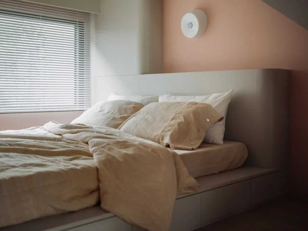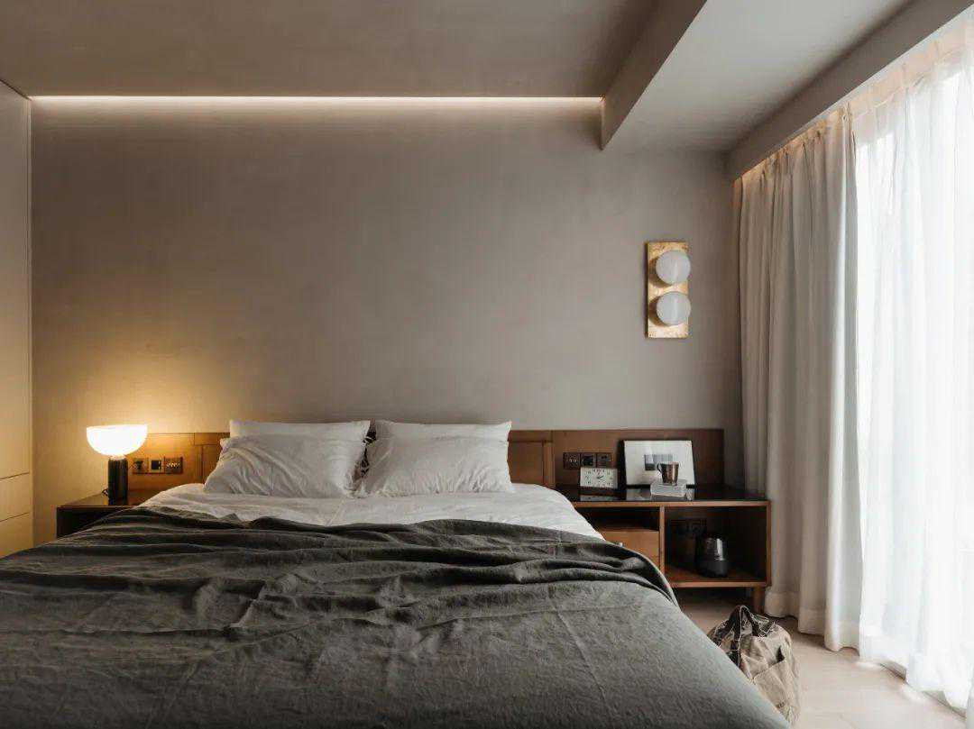 主卧,作为我主要的生活空间,我希望在这里得到最大的放松与自由。所以,主卫的墙体被打开,使得开放的盥洗区与衣柜咬合在了一起,同时,也与整个卧房融合在了一起。而原本飘窗的位置,也被拆除,并纳入到了卧房之中。一个较长的床头柜延展开来,通过极具攻击性的表达方式,将空间尺度进一步放大。