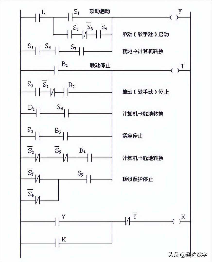其中,K为控制设备起/停的PLC输出信号,Y为启动逻辑信号,T为停止逻辑信号,由以下信号按一定逻辑关系产生:L,与该设备有联锁关系的其他设备运行状态;S1,上台设备启动后延时触发信号;S2,转换开关处于计算机控制方式;S3,监控画面单动/联动方式选择按钮,“1”为联动,“0”为单动;S4,监控画面单动按钮;S5,控制方式预转换按钮;S6,转换开关状态,为“1”表示处于就地控制;S7,设备正在运行状态,是中间继电器信号;B1,联动停止信号,由上台设备停止后触发产生;B2,监控画面停止按钮;D1,预转换过程结束信号,“1”表示转换结束,由定时器延时触发;B3,监控画面紧急停止按钮;B4,操作台紧急停止按钮;S8,与该设备存在联锁关系的其他设备运行状态;S9,该设备PLC控制输出状态,为“1”表示PLC控制线路接通。