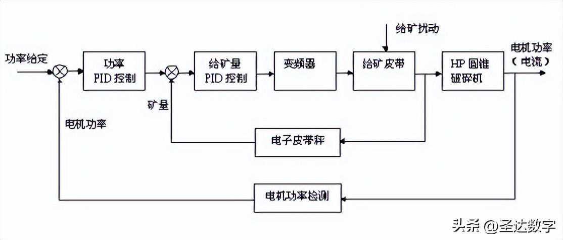 NordbergHP圆锥破碎机是本次项目改造中的关键设备,为使其稳定在最佳工作负荷状态,达到最大处理能力,采用恒定功率控制方式,以主传动电机的功率(电流)作为被控参数,通过变频调速,动态调整给矿皮带给矿量的大小。经实验分析发现,若仅以电机功率作为被控参数构成单回路控制系统,由于给矿皮带的传输需要一定的时间,即存在纯滞后,当给矿量扰动发生后,将导致调节作用大大滞后,且易发生振荡,系统动态品质难以保证。为了克服系统的纯滞后,决定采用串级控制:在给矿皮带上安装电子皮带秤,以给矿量为副参数,主传动电机的功率为主参数构成串级控制系统,见图2。