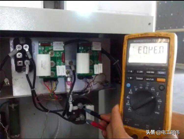 我们找到变频器内部直流电源的P端和N端,将万用表调到电阻X10档,用红表笔接到P端,黑表笔分别测量R、S、T进线端,应有大约几十欧的阻值,且测量的结果应该是基本平衡。相反将黑表笔接到P端,红表笔依次测量R、S、T进线端,测量的阻值应该是无穷大。我们再将红表笔接到N端,重复以上步骤,都应得到相同结果。如果有以下结果,可以判定电路已出现异常,A.阻值三相不平衡,可以说明整流桥故障。B.红表笔接P端时,电阻无穷大,可以断定整流桥故障或起动电阻出现故障。