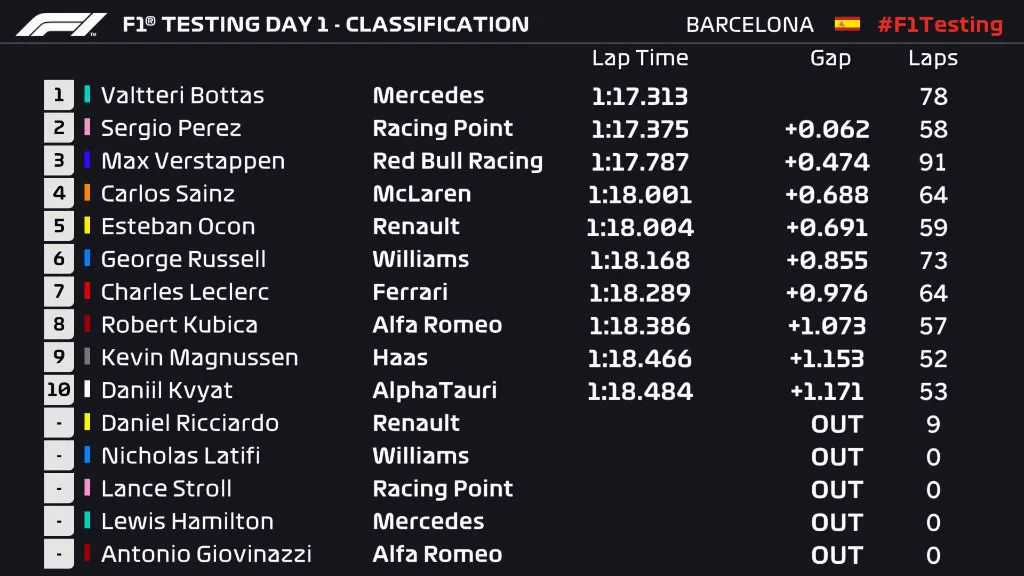冬测第一天当地时间上午的测试已经结束,博塔斯代表梅赛德斯车队做出全场最快圈速,而维斯塔潘以93圈排名测试里程第一。各车队成绩如下: