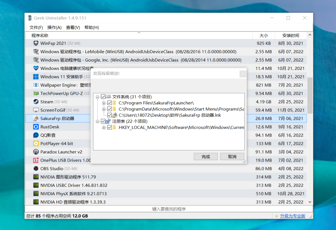 而GeekUninstaller除了可以把这些软件从电脑上删除,它还能把跟这些软件相关的文件、文件夹以及注册表也一并删了,要多彻底有多彻底:
