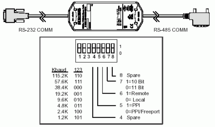 1)采用标准串口型号的西门子PC/PPI电缆。电缆波特率DIP开关设置如下: