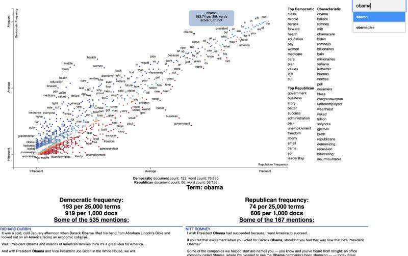 以下示例来自它的GitHub存储库,可视化了2012年美国大选中使用的术语。