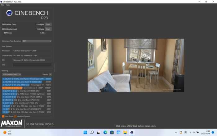 来到CineBenchR23,卓越模式下的H3CBookUltra14T得到了单核1645分,多核11934分的成绩。