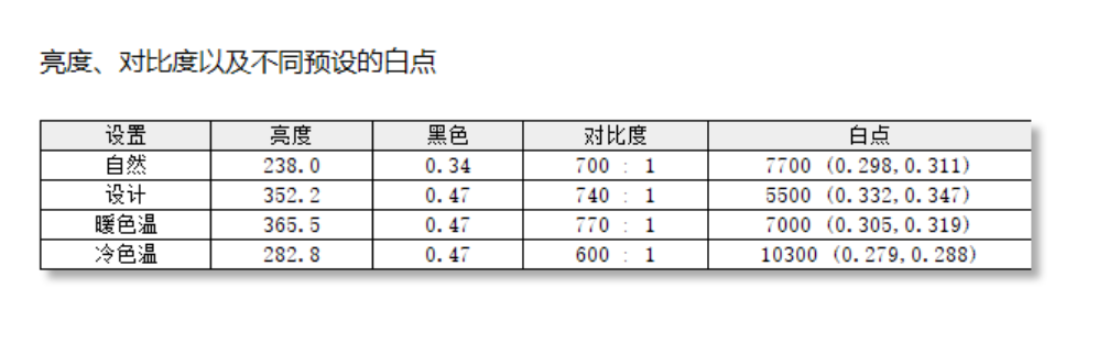 OSD内提供了四种预设色温模式,分别是自然、设计、暖色温以及冷色温,实测自然模式下色温7700K、设计模式5500K、暖色温模式色温7000K、冷色温模式10300K。