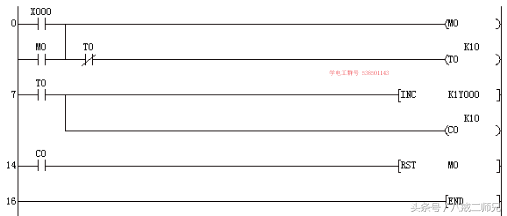 (4)不能把WXORP指令改为WXOR。WXORP和WXOR都是逻辑异或指令,但是:WXORP是脉冲执行型指令,在执行条件满足时,仅执行一个扫描周期;WXOR是连续执行型指令,在执行条件满足时,每一个扫描周期都要执行一次。在本梯形图中,[K2M0K0]是触点比较指令,后面用WXORP才正确。