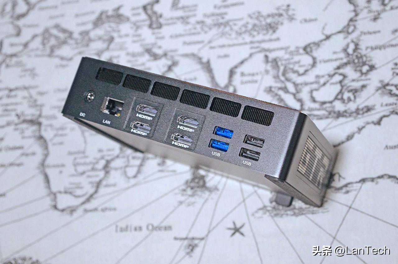 背板方面,可以看到上方大面积的出风口,整个散热模块的面积要比SER系列大了50%。接口方面,则提供了多达4个接口,可以同时外接四个屏幕进行画面输出: