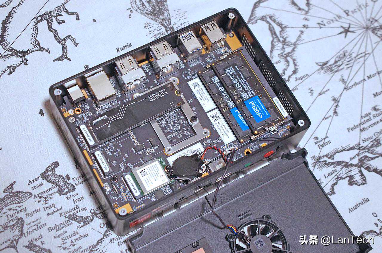 来看机箱内部,零刻GTR6高性能迷你电脑使用了金士顿KC3000固态硬盘,支持协议,并且还支持扩展一条规格的SSD。内存则是来自美光的DDR5内存,使用的都是大厂配件,相当厚道: