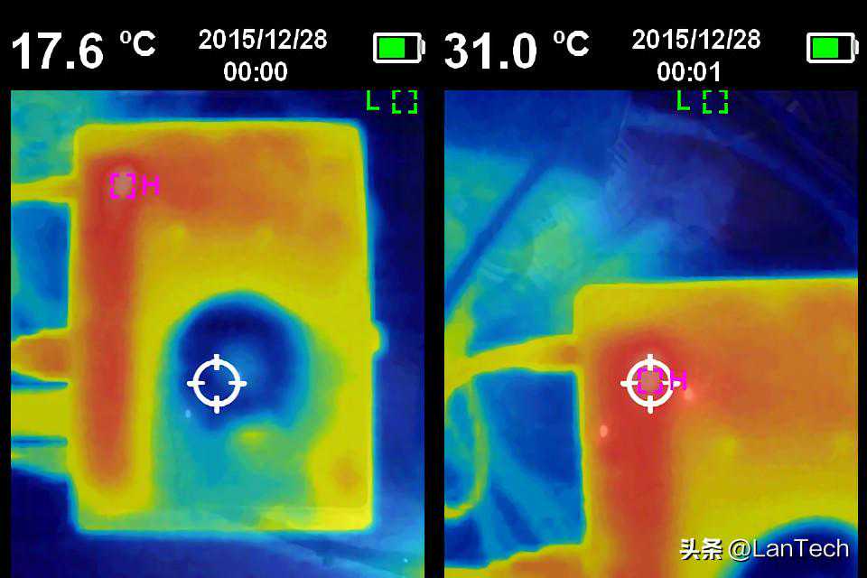 来看使用激光红外热像仪测得的机壳表面温度分布,顶面最高温出现在后方散热片位置: