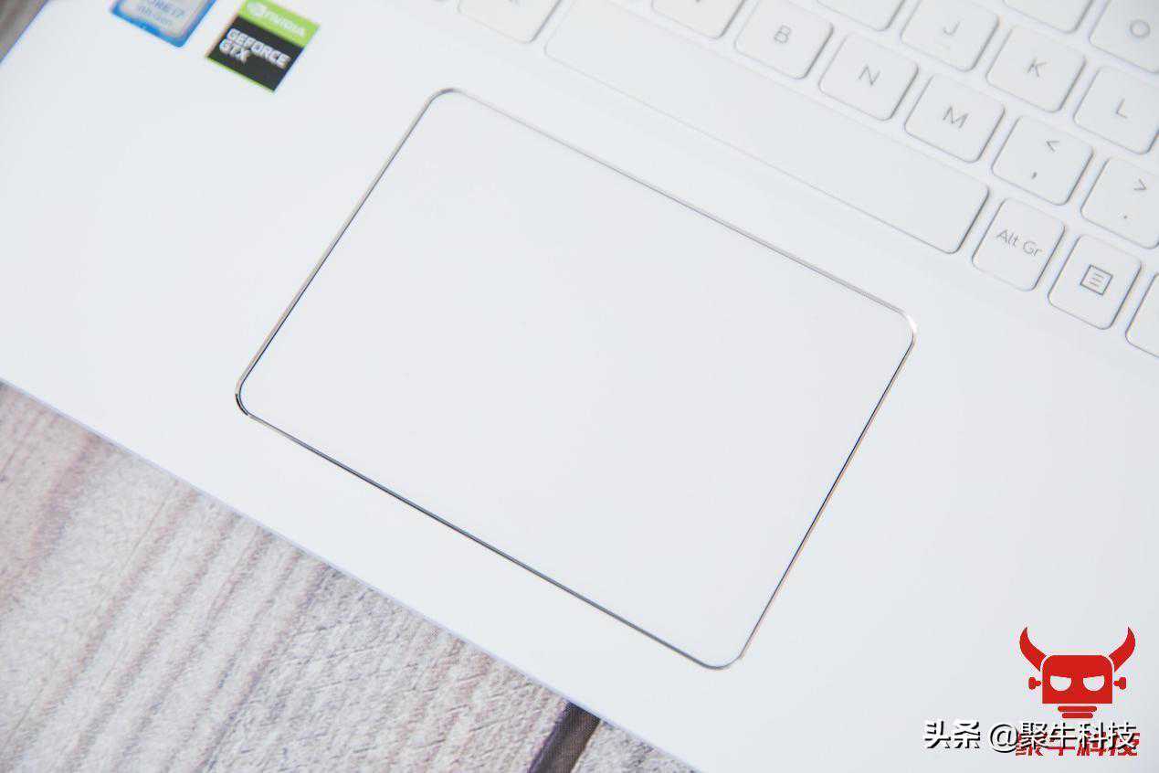 触摸板的区域没有设计的很大,偏置在键盘下方靠左的位置,触感不错但敲击体验一般,并非玻璃触摸板。不过在细节设计上,触摸板与右侧的指纹识别区域一样,边缘采用的全部都是钻石切割工艺,进而可以衬托出纯白素雅的气质。